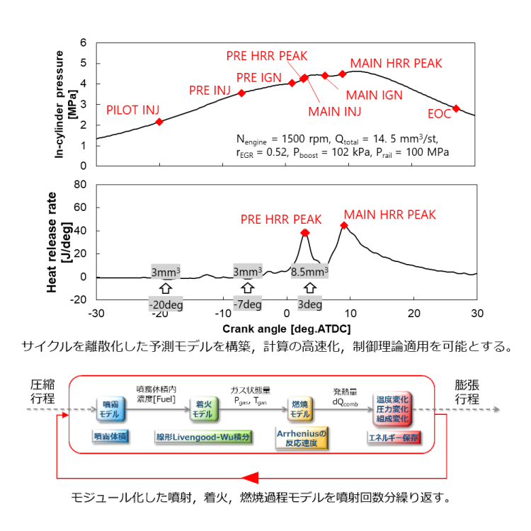 構築した制御モデルは燃焼予測モデルとも言え、燃料の噴射時期や回転数などの運転条件を入力すると、燃焼時の圧力や熱発生率の特徴点を出力するモデルである。制御に利用するためには、この逆系(y=f(x)→x=f -1 (y))を求めて、熱発生率のピーク時期などの燃焼の目標値を与えることで、噴射時期などの操作量が得られることとなる(フィードフォワード制御器)。一方で、モデルを完全に実機の燃焼と一致させることは難しく、何らかの補正が必要となる(フィードバック制御器)。このフィードバック制御器設計でも、制御モデルの利用により容易に様々な制御理論の適用が可能となった。