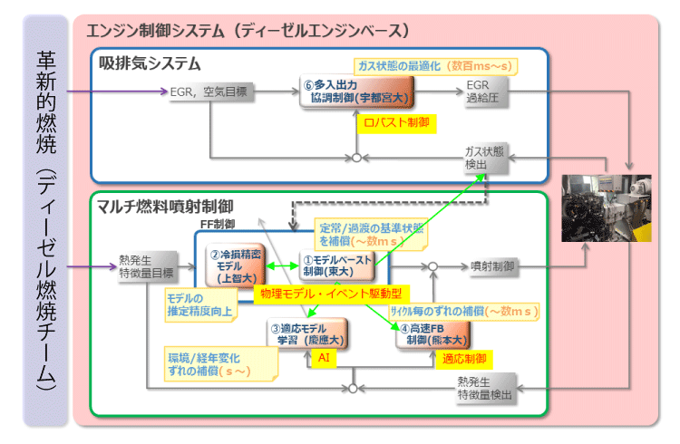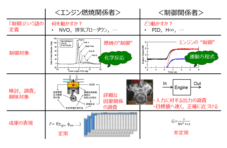 モデルベースで構築した燃焼制御システムの有効性を実機での制御試験で実証図2-3(動画)したが、モデルの果たす役割は、現象予測や制御利用に留まらないことを実感した。制御グループでは、エンジン燃焼研究の経験のある研究者と、これまでエンジン燃焼を扱ったことのない制御の研究者が協力して研究を実施した。ここで、重要な役割を果たしたのが制御モデルであった。両者の間では、「制御」という言葉一つとっても定義が異なっており、話が伝わらない、理解できないということが当初あった。しかし、数式で記述されたモデルを介して議論を進めることで意思疎通が円滑になり一つの制御システムにまでまとめ上げることが可能となった。