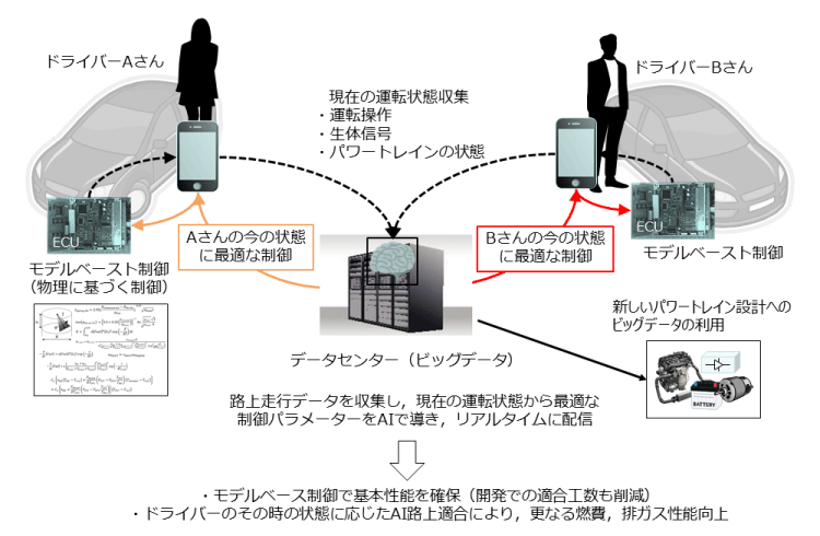 SIPで構築した制御システムは、高効率、低公害な次世代燃焼の導入によって車両自体の燃費、排気性能の向上が期待できる。しかし、構築した制御システムにおいても制御目標値の設定は行う必要がある。ドライバーの特性は様々で一律な目標値設定を行うと性能を出し切れない。そこで、ドライバーの特性(2-4)、またドライバーに影響を及ぼすような信号などの交通インフラや周囲の交通状況なども踏まえて、リアルタイムに目標値設定などを行う仕掛けが必要となる。これには不確定要素の高い人間(ドライバー)の挙動や、世界中から集まる大量のデータを扱うために、AI技術なども活用したシステムへの拡張が必要となる。