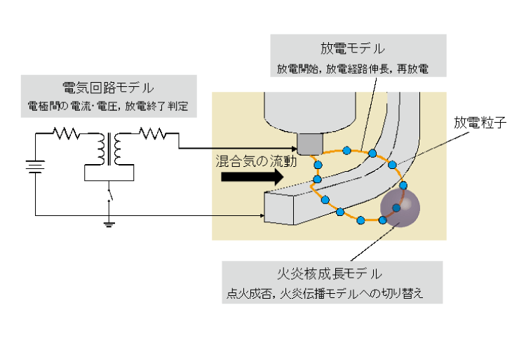 火花点火は点火装置(電気回路)を用いて電極間に数万Vの電圧を与え、電極間の絶縁を破壊して電流を流し(火花放電)、混合気を着火させる。火花放電は点火装置における二次コイルのエネルギーが消費されるまで続く。エンジン筒内の高圧場かつ高流動場では、放電経路は下流に流され(放電経路伸長)、放電経路の短絡や再放電とよばれる現象が生じる。火炎核は量論混合気では電極間から発達し、希薄混合気では火炎核成長が遅いことや放電経路伸長によって、電極間の下流から発達する。火花点火モデルでは、これらの現象を電気回路、放電、火炎核成長のモデルで記述し(図4-1)、CFDコード(HINOCA)に組み込んでいる。