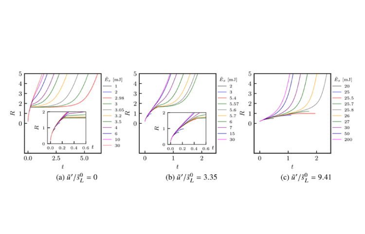 放電開始直後に放電粒子位置で任意の大きさを持つ火炎核が形成され、火炎核は放電による熱膨張と火炎核の曲率を考慮した乱流燃焼速度に従って成長するとモデル化される。火炎核径が一定の大きさを超えると着火したとみなして、火炎伝播モデル(G方程式など)の初期値を与え、これ以後は火炎伝播モデルで燃焼を計算する。さらに、著者は熱爆発理論をベースに、一次元のエネルギー式と燃料の化学種保存式を線形化して得られる代数方程式により火炎核の成長を計算する手法を考案している(4-2)。図4-3は火炎核成長(火炎核半径、R、の時間変化)の計算例である。点火エネルギーが小さい場合に失火、乱流強度が増加すると最小点火エネルギーが増加する過程を予測できる。