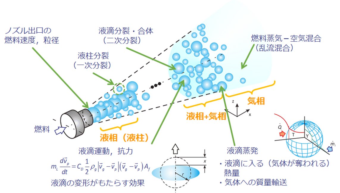 燃料噴霧の現象を数値解析するには、気液二相間の質量、運動量、エネルギーの受け渡しである相互相関と噴霧の微粒化過程に関する①噴孔内部の燃料状況を加味した流出条件、②液柱・液滴の運動、③液柱(一次)分裂、④液滴(二次)分裂・合体、⑤液滴蒸発、⑥燃料蒸気‐空気(乱流)混合、など燃料が液体から気体へと変化していく過程を再現できるようにしなければならない。基本的には、これらの物理現象を統一的に表現することのできる物理モデルはなく、それぞれの現象を個別の物理モデルで表現し、定式化することで数値解析に用いることができる数値モデルにしている。 燃料噴霧の物理モデルの概念図を図5-1に示す。