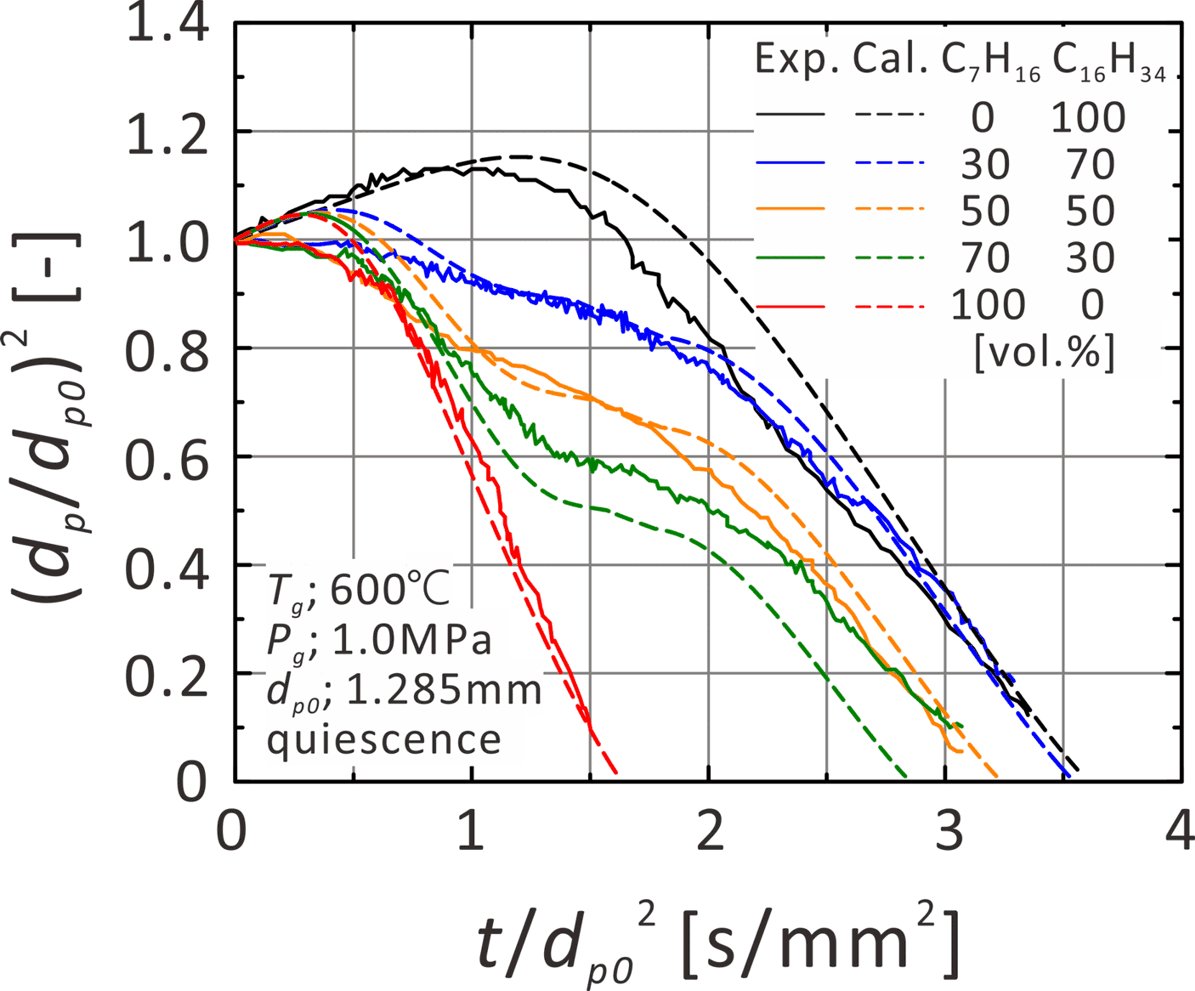 蒸発噴霧は、上に示した数値モデル群を総合的に評価できるため、最終的なモデルの検証対象とした。各数値モデルについては、①噴霧の前に単一液滴によって多成分系の液滴蒸発モデルと物性推算法を、②非蒸発噴霧において液滴分裂モデルであるKH-RT(Kelvin-Helmholtz, Rayleigh-Taylor)モデルのモデル定数の効果を検証した。図5-2に燃料混合比を変更した時の単一液滴の蒸発特性を示す。単成分の場合には、蒸発初期に体積膨張による液滴径の増加を生じた後にほぼ直線的に液滴径の二乗が変化していく領域がある。それに対して二成分が混合されると蒸発中に傾きが変化する領域があり、これらを再現することができた。KH-RTモデルのモデル定数を変更したときの噴霧形状の変化を図5-3に示す。B1はKH分裂時間に関する定数、C3はRT分裂径に関する定数である。液滴径がモデル定数によって変化することで、噴霧形状に違いが現れることが確認できた。