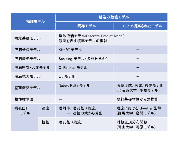 HINOCAの噴霧プログラムは、JAXAが担当したCFDプラットホーム上にサブモデルの形で実装されている。燃料液体と気液相関の数値モデルには離散液滴モデル(DDM)を用いている。これは、様々な商用ソフトにおいて採用されている手法で、エンジン内の噴霧・混合気形成を予測する上で最も一般的であると考え、HINOCAでも採用している。DDMは、パーセルと呼ばれる液滴個数に関する確率密度関数の離散化から求められる同一液滴径、速度、位置、温度となる液滴のグループ化と、このパーセルをポイントソースとして気相方程式に気液間の質量、運動量、エネルギー保存が成立するように相互干渉項として組み込む、二つの数値モデルによって構成されている。 HINOCAに組み込んである噴霧モデルの一覧を表5-1に示す。各現象に対して、最も一般的と考えられる数値モデル(既存モデル)を組み込み、SIP内にて新たに提案された数値モデルも実装されている。