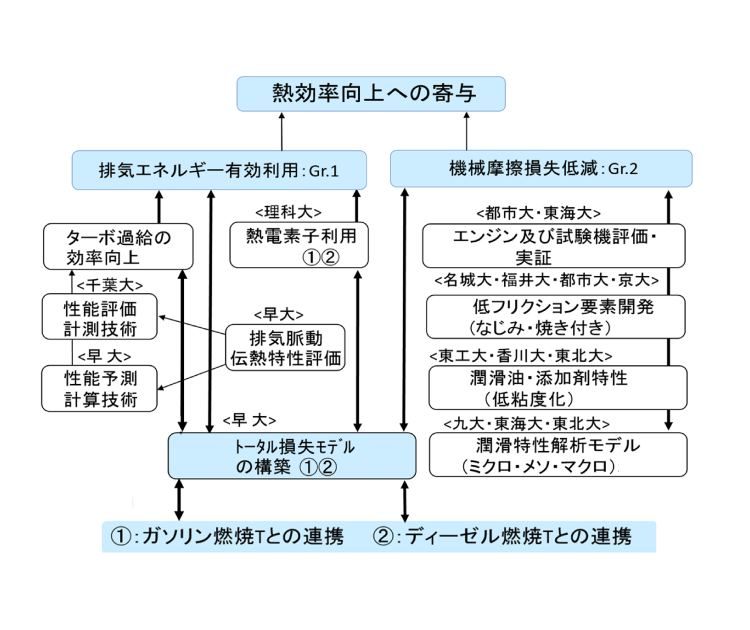 本チームでは、「ガソリン」と「ディーゼル」の両エンジンチームに対して、燃焼室内での熱損失の抑制を除き、エンジンから失われるエネルギーを抑制する、あるいはそれを有効利用する技術を提示することを狙いとした。具体的には、脈動流を考慮したターボ過給機の高性能化と排気熱を利用した熱電発電をテーマとする「排気エネルギー有効利用:Gr.1」、およびエンジンの機械摩擦損失の半減と焼き付きやオイル消費の抑制を狙いとする「機械摩擦損失低減:Gr.2」の2グループに分かれて取り組んだ。チームリーダーとGr.1の長は早大・大聖が、Gr.2の長は東京都市大学・三原雄司教授が担当して研究の進捗を管理し、成果を取りまとめた。 研究の実施に当たっては、ほかのチームと同様、自動車用内燃機関技術研究組合(AICE)の会員企業の専門分野の方々から積極的な技術支援を得て、製品化手前の非競争領域として共有できる技術に焦点を絞った。図1-1に示すように、チームの研究組織としては、緊密な連携体制のもと、各種のエンジン要素部品を対象に、関連実験設備を共同利用して新たな各種計測技術の開発に挑戦した。さらには、それらの性能や特性を予測する各種のサブモデルを開発し、それらを活用してエンジンサイクルの正味熱効率を評価する数値シミュレーションモデルを構築した。その結果、ガソリン、ディーゼル両エンジンに対して、3%を超える正味熱効率の向上をもたらし、目標とした50%の達成に貢献することができた。 各課題の成果については、「2 早稲田大学・宮川」、「3 東京理科大学・飯田」、「4 東京都市大学・三原」で紹介する。