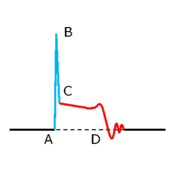 火花放電の過程は時間の経過順に、①混合気の絶縁破壊に至る過程(A-B点)、②その後の容量放電の期間(B-C間)、③誘導放電の期間(C-D)に大別される。(図2参照)この過程で放電エネルギーが熱に変換され放電経路の混合気に供給される。