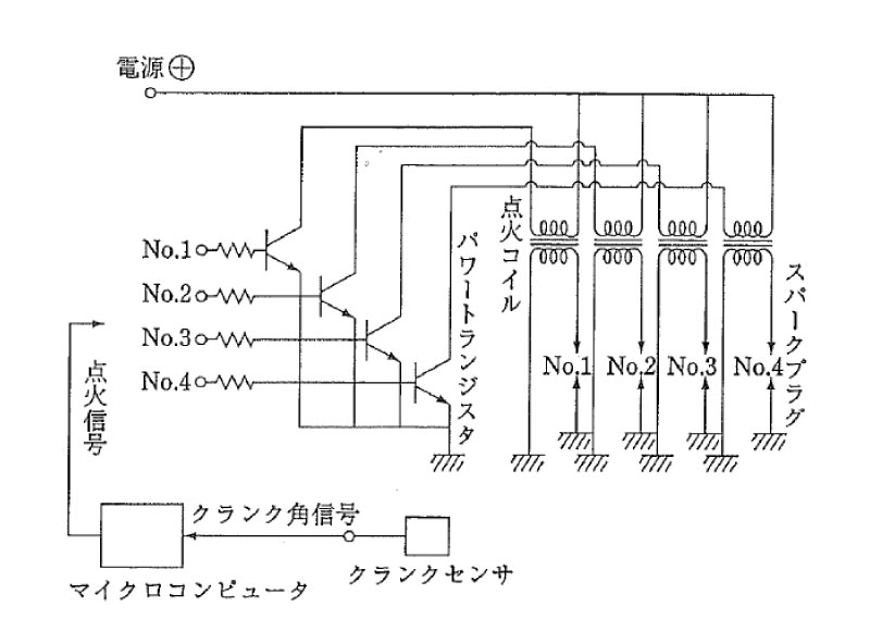 火花放電を行う装置は、クランク位相を検出するクランクセンサ、スパークプラグに火花を飛ばすタイミングを決める電子回路、高電圧発生のために電流のON/OFFを行うパワートランジスタ、高電圧を発生する点火コイル、エンジン燃焼室内で混合気に火花を飛ばすスパークプラグからなる。(図6)