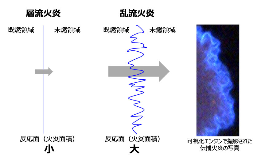このとき燃焼速度は、高温である反応帯や既燃領域から、低温である未燃領域に与えられる熱量(単位時間当たりに未燃領域に移動する熱量)の大きさで決まる。例えば、リーン化や排ガス再循環(EGR)を行うと火炎温度が低下するため、未燃部に与えられる熱量も低下する。その結果、火炎伝播速度が低下することになる。