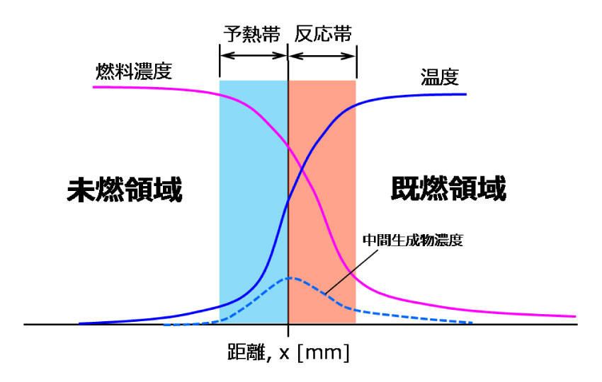 図2に、層流一次元火炎の構造を模式的に示す。高温酸化反応による活発な化学反応によって高温になった反応帯からの熱移動によって未燃部が加熱され、次々に燃焼に至る。この加熱される区間を予熱帯と呼ぶ。