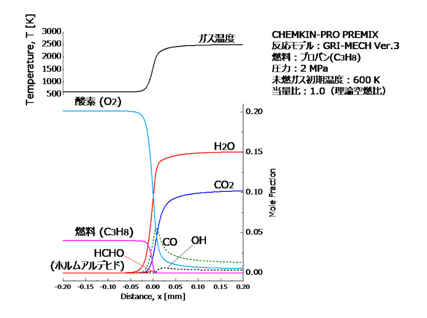燃料と酸化剤は、理論空燃比のプロパン-空気予混合気である。エンジン燃焼室内を想定して、圧力2 MPa、未燃ガス温度600 Kで計算を行っている。反応が起こると、燃料が急激に消費されつつ、温度が上昇し、最終生成物である二酸化炭素(CO2)と水(H2O)が生成する。その間に、ホルムアルデヒド(HCHO)、OHラジカル、一酸化炭素(CO)その他さまざまな中間生成物が生成される。
