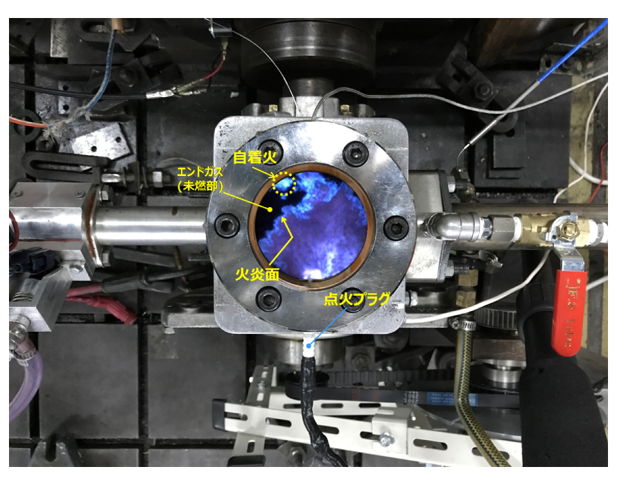 図6に、シリンダボア全域を可視化した2ストロークエンジンで撮影された、ノッキング(スパークノック)が起こる瞬間の写真の一コマを示す。写真の下側に点火プラグがあり、下から上に火炎伝播をしている。火炎伝播燃焼が燃焼室全域に至る前に、図中に破線で囲った領域のように、自着火が発生することで、筒内ガスに圧力振動(ノッキング)が発生する。