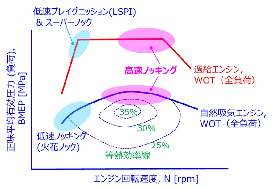 このように、高速域で発生するノッキングを高速ノッキングと呼ぶ。高速ノッキングに対応させて、低速高負荷で生じる火花ノックを低速ノッキングと呼ぶこともある。