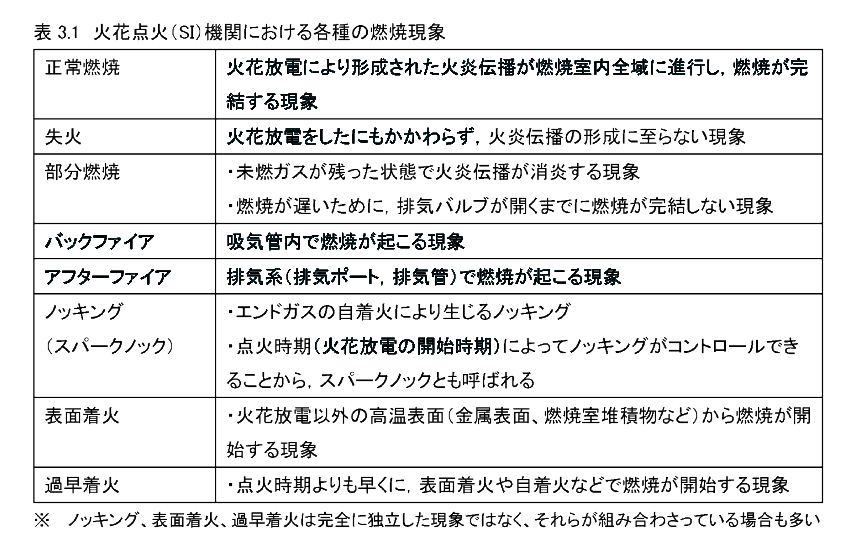 ガソリンエンジンにおける、各種の燃焼現象の概要を表1に示す。
