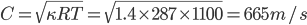 κを、標準状態の空気の値(κ=1.4)とし、空気の気体定数278 J/(kg・K)を用いて1100 Kでの音速を計算すると次のようになる。