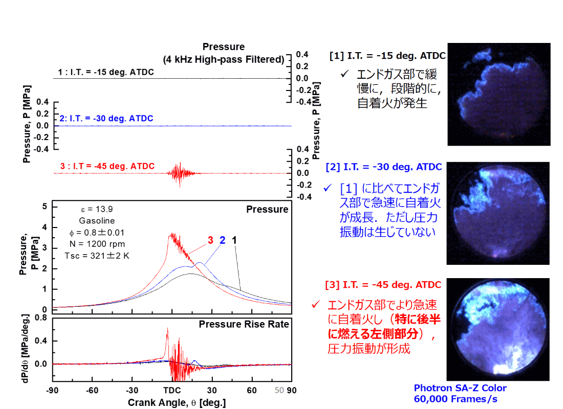 近年、高過給のガソリンエンジンにおいて、低速高負荷時に何らかの要因でプレイグニッション(LSPI: Low-Speed Pre-Ignition)が発生すると、非常に強いノッキングに進展することが問題になっている。この時に発生する非常に強いノッキングは、前述の現象によってもたらされているのではないかと考えられ、さらなるメカニズム解明とその知見に基づくノッキング抑制技術の創出が必要だと考える。
