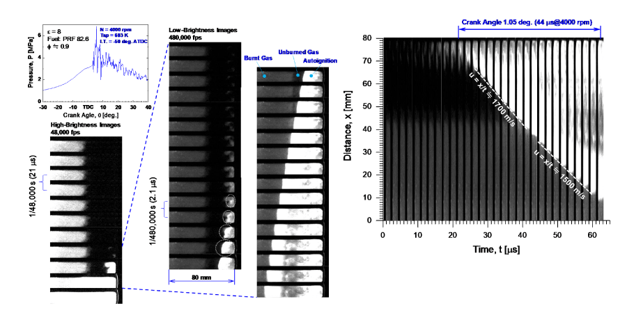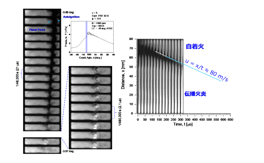 比較的弱いノッキング発生時の燃焼可視化結果(2)を図13に示す。圧力振動の発生挙動を可視化するために、毎秒480,000コマの高速撮影を行っている。このケースでは、左から右に向かう火炎伝播の進行中に、右端のエンドガス部から自着火が発生し、伝播火炎が向かってくる左方向に見かけ上伝播するかのように成長していることが分かる。その後、火炎面と自着火に挟まれた、破線の丸で囲った未燃領域で、輝度が高い自着火が発生した後、未燃領域が急速に燃焼し圧力振動が発生している。図13の右側の図は、これらの燃焼写真を左に90°回転させて並べて、時間と自着火成長距離の関係に示したものである。この図の自着火の先端部をつないだ線の傾きが、自着火の進行速度になる。この条件では、自着火の進行は、80 m/s程度であり、常温での音速(約340 m/s)よりもはるかに低い数値であることが分かる。また、この速度で自着火が進行する条件では、明確な圧力振動は発生していない(圧力振動が発生するのは、自着火と火炎伝播に挟まれた領域で高輝度かつ急速な自着火が発生したときである)。つまり、緩慢な自着火だけで燃焼を完了することができれば、自着火したとしてもノッキングには至らないと言える。