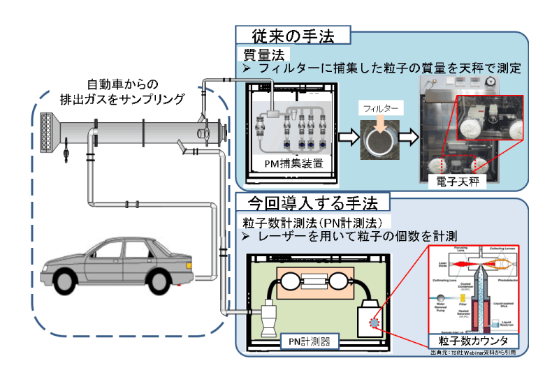 従来のPM規制における測定法は、フィルタに捕集した粒子の質量を測定する手法であり、PM排出量の低減に伴う測定感度の課題から、規制値の大幅な引き下げは困難となってきている。一方で、粒子数をカウントするPN計測法を用いれば、より高感度な計測が可能となる。
