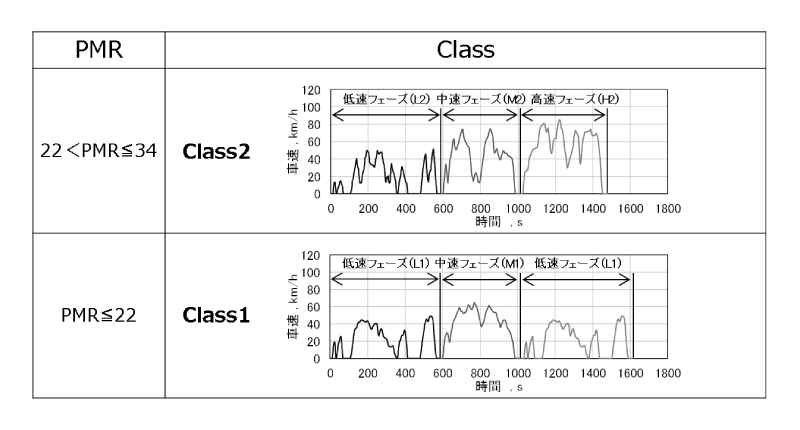 WLTCを適用する車両については、PMR(Power to Mass Ratio)が小さい順からClass1、Class2およびClass3と区分されている。