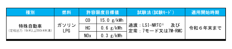 なお、LSI-NRTCよりも排出量が多くなるエンジンもあることから、C2モードについても採用を継続し、米国においてC2モードと選択制になっている7M-RMCについてもC2モードと同等のサイクルであることから、選択式で導入することが適当であることが示された。許容限度目標値については表2のとおり。