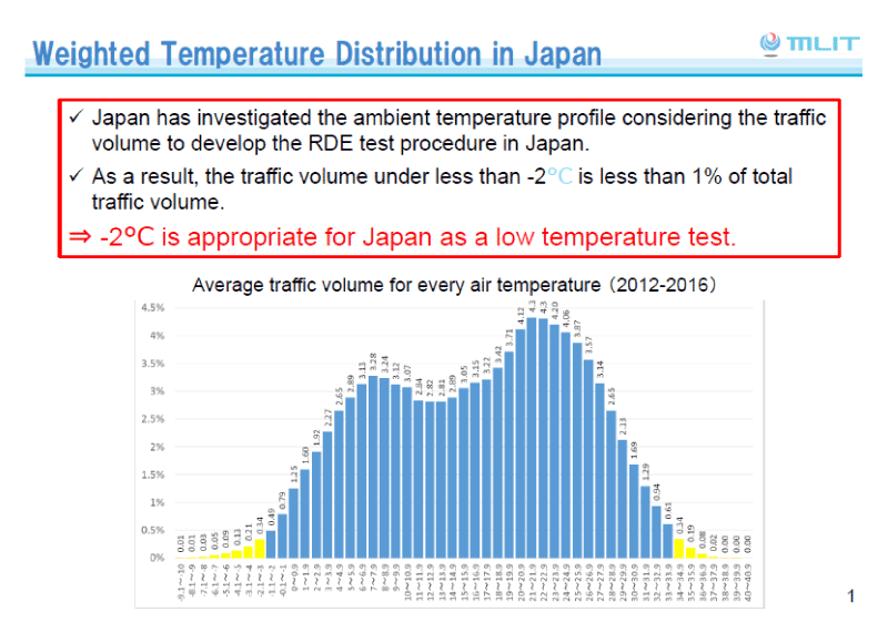 特にこの中でも議論に時間を要したのが低温試験法であった。日本では、低温下における交通量も比較的多いことから低温試験の導入が検討されており、中央環境審議会「今後の自動車排出ガス低減対策のあり方について」の第十三、十四次報告でも今後の検討課題として言及されているところである。一方、欧州が採用してきたUNR No.83にはすでに-7℃を試験温度とする低温試験法が導入されており、UN GTR No.15 Amendment 6の検討の際も欧州が提案した試験温度は-7℃であった。日本では、国内のRDE(Real Driving Emission)試験について検討するため各都道府県別の気温別交通量調査を実施した結果から、-2℃以下に占める割合は1%以下であったことから、低温試験における試験温度としては-2℃が適当であると主張した(図3参照)。しかしながら、国際基準としてより多くの地域の環境をカバーすることが望ましいことから、今後高温試験の試験温度を検討する際には日本の実態に合わせて38℃をベースとすることを条件に、-7℃の低温条件に賛成することとなった。