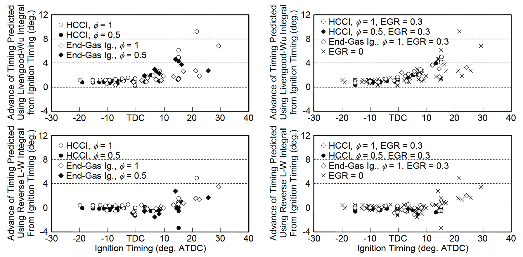 桑原(1)は、ノッキング予測手法として知られているLivengood-Wu 積分に改良を加え、計算負荷が小さく、汎用的な高精度自着火予測モデルに関する講演を行った。今回は第6報として、今まで発表されてきた、①着火遅れ時間の総括式、②誤差補正式に修正を加えた。さらに総括式と誤差補正式を用いた遡り型Livengood-Wu 積分を提唱し予測精度の向上に効果的であることを検証し、これらの式の最終版を提示した。図1に結果を示す。左図はEGR なし、右図はEGRありの条件を示し、下段に示す本手法の効果は明確である。EGR無しで得られた誤差補正式が、EGR でも有効であるとの見解に関心を引く。進角誤差低減の効果が効きすぎて大きな遅角誤差が生じる場合が稀に見られると述べており、この理由を明らかにし、その要因を調整できる機能が追加することが期待される。