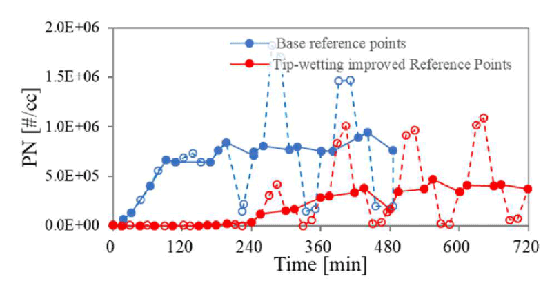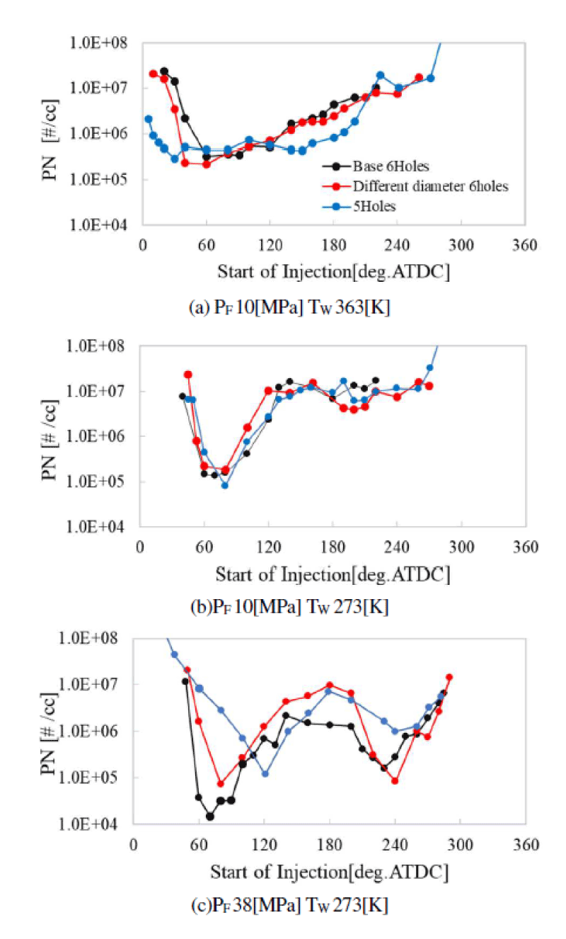 加藤ら(1)は筒内直噴エンジンのすす排出低減を目的とした燃料噴射系の開発手法について講演した。具体的にはインジェクタのTip-wetに起因するTip-sootの低減と、ピストン冠面およびライナへの燃料付着に影響する噴霧パターンを取り上げた。Tip-sootについては各種の運転条件がPNドリフトに及ぼす影響を明らかにしてインジェクタのエージング条件を決定し、噴口内部流路の最適化と段付き噴口を組み合わせた改良インジェクタでベースに比べてPNを48%低減した(図1)。噴霧パターンについては等流量分配6孔のベースパターンとピストン方向の噴口流量を減らした2種類のパターンを比較し、暖機後と低水温では噴霧パターンのPNへの影響が異なるため冷間時専用の噴射制御が必要であるとの結論を得た(図2)。