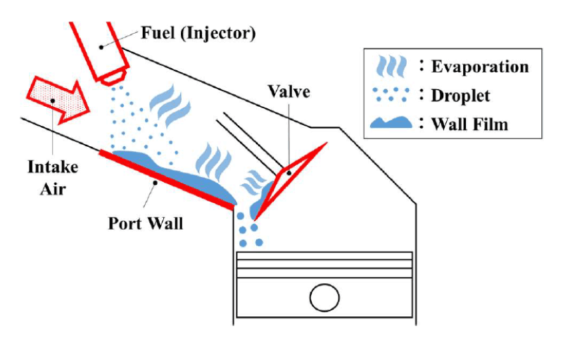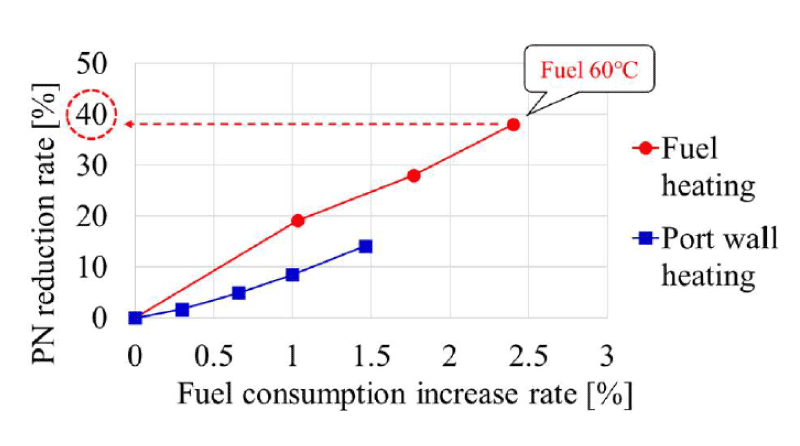 田中ら(2)はポート噴射エンジンの暖機途中におけるすす排出量を低減するため、吸気ポート周辺部位を加熱して燃料液滴と液膜を蒸発させる手法を試みた。加熱対象の候補として燃料、吸入空気、吸気ポート壁面、吸気バルブを挙げて(図3)燃料挙動をシミュレーションした結果、燃料と吸気ポートを加熱したときの燃料の蒸発効果が高かったため、そのふたつを採用してエンジン試験を行った。エンジン水温-7℃でのエンジン試験の結果をRDEに適合した0℃始動の実車走行モードに当てはめてすす低減効果を推定したところ、燃料加熱の方がポート加熱より電力消費に伴う燃料消費に対するすす低減効果が大きく、燃料温度を60℃まで上げることですすの発生を40%低減できた(図4)。
