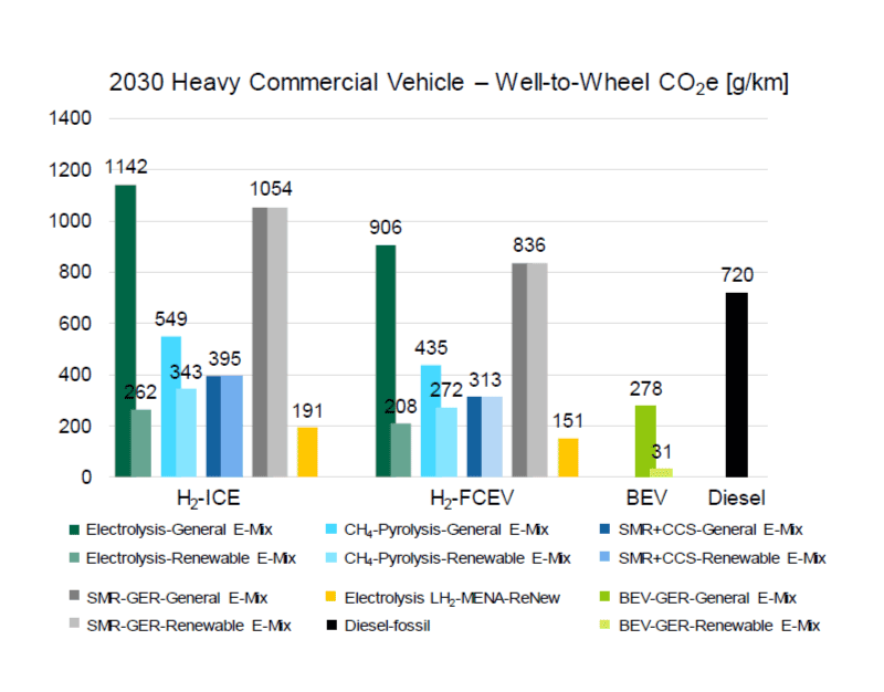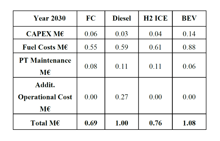 一方、欧州では、水素をエネルギーキャリアとして再生可能エネルギーを大幅に導入し、モビリティ動力としても利用する構想が進められており、当セッションの残りの3件は、いずれも欧州からの水素利用に関する発表であった。Danzerら(2)は、再エネ由来のグリーン水素含め、さまざまな方法により製造される水素を、乗用車と大型車においてFCV(燃料電池車)と水素ICEとして利用した場合のWtWのCO2排出量を解析し、BEVや高効率ディーゼル車の場合と比較している。解析結果から、乗用車用動力には水素FCVがCO2排出低減に効果的であるとしている。長距離輸送用大型車の動力については、乗用車に比べ多様性が高く(図2)、エネルギーインフラの整備状況により、水素FCV、水素ICE、ディーゼル、BEVが時と場合に応じて使用されるとしている。また、Rothbartら(3)は、水素FCV、水素ICE、ディーゼル、BEVの利用者負担コストを解析している。解析結果から長距離輸送用大型車の場合には、2030年における利用者負担コストは、水素FCVと水素ICEがほかに比べ低いとしている(表1)。最後にRaserら(4)は、大型車用水素ICEについて、実機計測も含め、さまざまな水素供給方法での技術課題を提示している。水素ICEについては、長距離輸送用大型車の動力源として水素FCVやBEVが成熟するまでの水素利用技術としての可能性が残されているかもしれない。