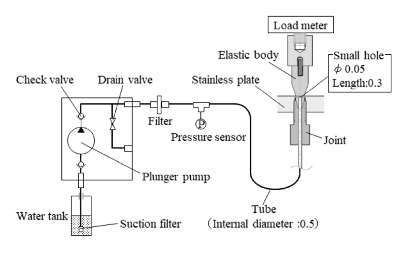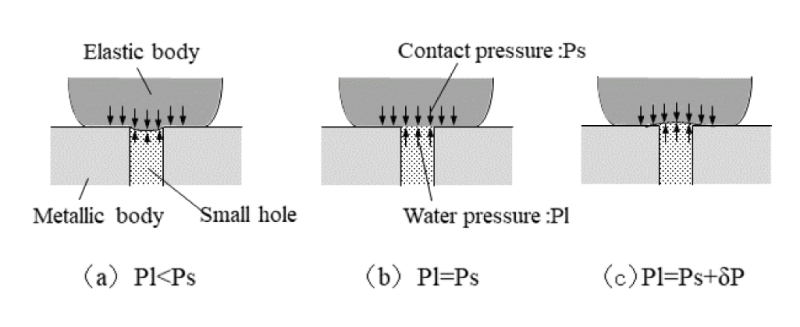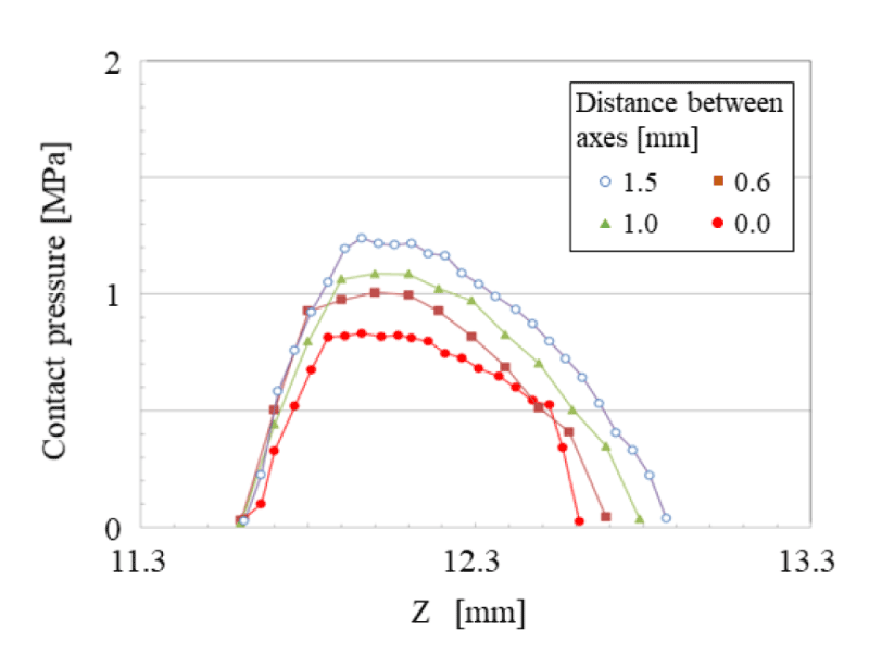 講演番号236では、円筒面に用いられるリップシール部の面圧分布の測定手法についてSOKENの尾崎氏より紹介された。漏れを防止するためには面圧分布測定の際の分解能が重要である。ここでは目標を分解能50㎛として測定手法の開発を行っている。シール部に対し直径50㎛の細穴を設け、そこに外部から水を供給している。ここでリップ部の面圧が高ければ水は細穴に押し戻され、逆に低ければ水が流出する。これを水圧の測定により検知する仕組みである(図2図3)。当該細穴を設けた模擬軸を用いて面圧分布の測定が可能である。実際に軸の直径が公差内で変化したときの面圧や、軸が偏心したときの面圧(図4)が示されているが、いずれも妥当と思われる結果が得られている。実部品での測定ができない点は残念であるが、軸の真円度の影響なども調査できると思われ、応用範囲の広い測定手法であると考えられる。