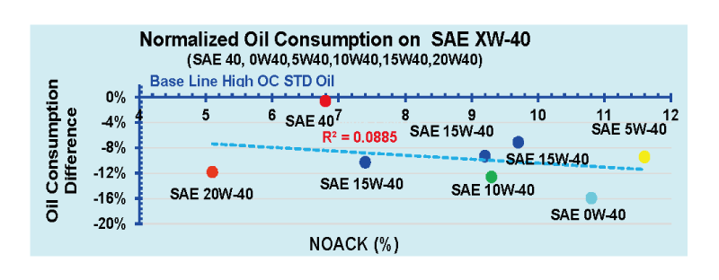 講演番号239では、ベアケミカル&液体マシンテクノロジーの渡邊氏より、図5に示すようにオイルの蒸発特性を表すNOACK値とオイル消費の間の相関が高くないこと、また図6に示すように粘度グレードがワイドレンジになるにしたがって、すなわち粘度指数向上剤の添加量が増加するにしたがって、NOACK値が高くても少ないオイル消費を示すことなどが示された。これらは数多くの供試オイルについてエンジン試験により測定された結果の分析により示されている。オイルの観点からオイル消費を考えたとき、分子間力すなわち蒸発力に着目すべきと考えられることなどが述べられていた。第2報、第3報でさらに詳細について紹介されるとのことである。