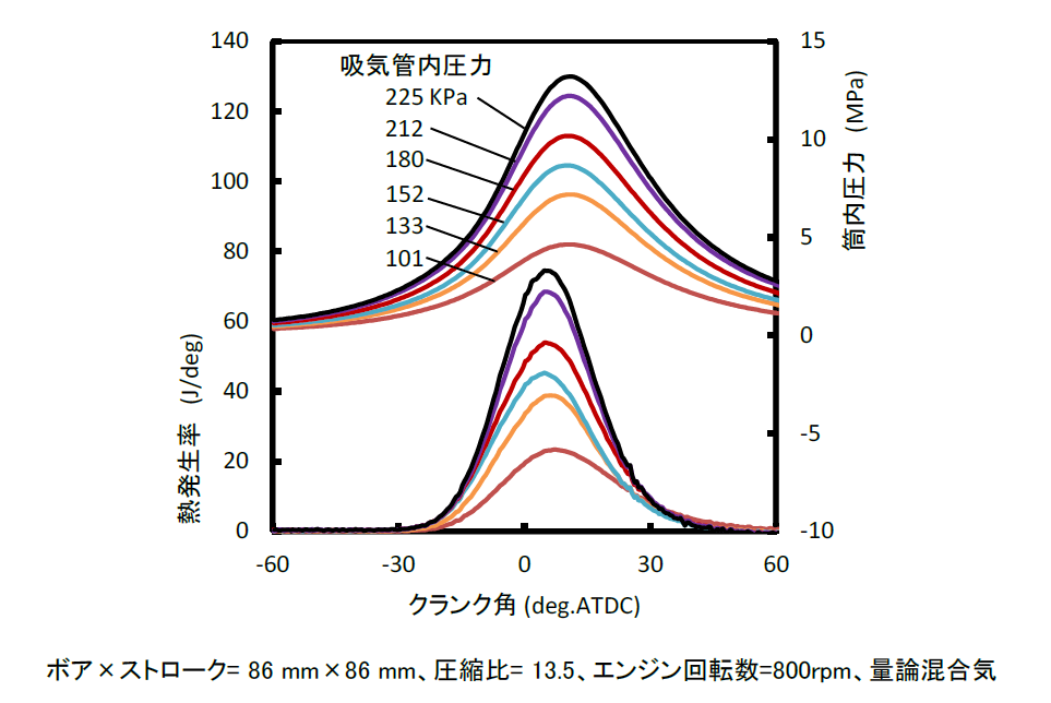 表1に示したようにNH3はほかの燃料に比べて自着火温度が高いため、高負荷では補助燃料を減らしてNH3割合を高くする方がノッキングに対して有利である。NH3混焼では負荷が高くなるほど燃焼安定化に必要な補助燃料の割合が小さくなる特徴があり、低中回転域の中負荷以上では補助燃料を供給しなくてもIMEPの変動率を小さく抑えられる。図2は加圧空気を用いた過給模擬試験によりNH3燃焼のノッキング抑制効果を調べた結果を示す。すべての条件でノッキング発生がなく、点火時期をMBTまで進角できるため、吸気圧力にかかわらず同じタイミングで熱発生と最大筒内圧力が得られていることがわかる。このときの最大IMEPは2MPaを超えており、過給による高トルク化に対して有利な燃料であると考えられる。