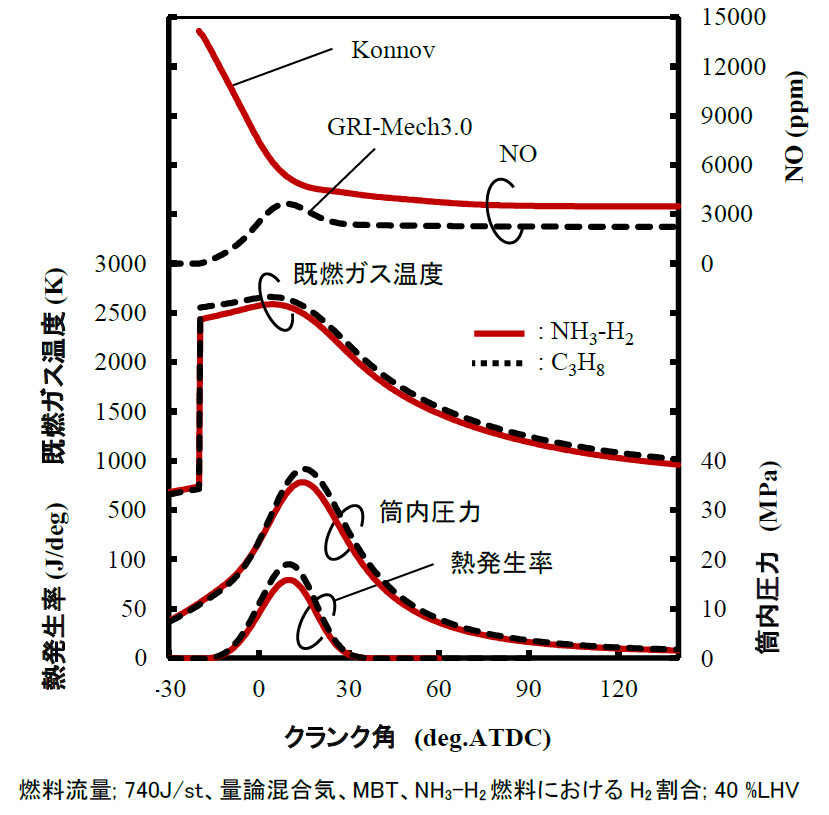 アンモニア(NH3)は燃焼速度が小さく、火花点火エンジンの多様な運転条件において安定燃焼を実現するためには補助燃料が必要である。水素(H2)は炭素を含まず、燃焼速度の大きい優れた補助燃料であり、NH3分解により必要な量のH2をオンボードで生成することも可能である。NH3は自着火温度が高いため、高圧縮比化が可能であり、過給条件下でも最適点火時期(MBT)で運転することができる。燃焼ガス中に含まれる窒素酸化物(NOx)はNH3の酸化過程で生成するフューエルNOxであり、点火遅角や希釈等の燃焼温度低減によるNOx抑制効果は期待できないため、量論混合気と三元触媒を組み合わせた排気浄化システムが適している。