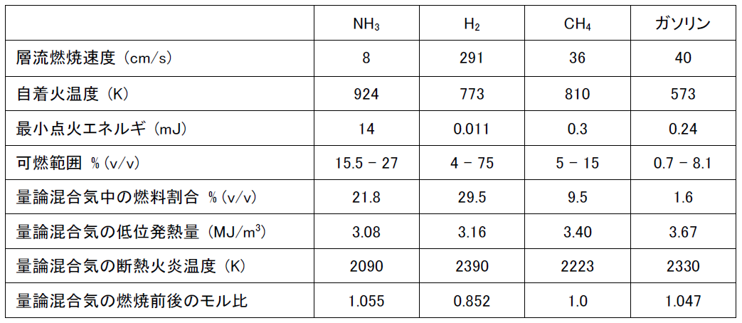 液化NH3は体積当たりのH2密度が高く、H2のエネルギーキャリアとして注目されている。NH3はH2に戻さずとも脱炭素燃料として利用できる利点があり、火力発電所や船舶では既に具体的な検討が始まっている。表1はレシプロエンジンに関係する諸特性を示す。NH3は燃焼速度が小さく、自着火温度が高い特徴がある。高圧縮比化が可能であり、燃焼生成物の1/4が窒素(N2)で火炎温度が低いために比熱比が大きい。さらに燃焼前後でモル数が増加するなど熱効率に対して有利な特性を持つ。一方、過去のエンジン試験から、NH3単独による圧縮着火燃焼は極めて困難なこと、火花点火燃焼は安定燃焼可能な運転範囲が限られることが分かっており、補助燃料が必須と考えられている。