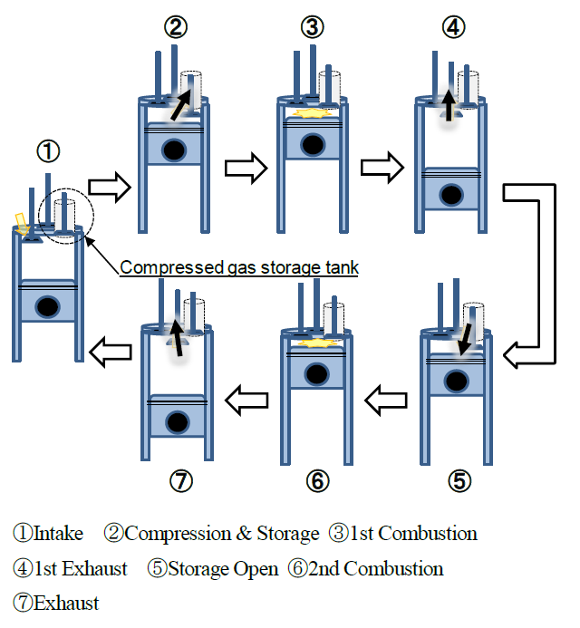 過給ディーゼルエンジンは比出力および熱効率の向上を進めると最大筒内圧力が上昇する傾向にあり、更なる改善には筒内圧力の許容値が制約となることが懸念される。 長田ら(1)はこの課題に対してストレージ付6ストロークサイクルを検討した。これは1回の圧縮行程で得た高温高圧空気を2回の燃焼行程に分けて利用する方法で、一部の圧縮空気を貯めるストレージタンクがヘッド側に設けられている。最大筒内圧力が4ストロークサイクルと同じ条件では幾何学圧縮比を大きくでき、高膨張比による熱効率改善とトルク向上が得られることが示されている。一方、熱損失を含めたシミュレーションでは期待した熱効率向上が難しく、大幅な冷却損失改善が必要としている。このような従来の方式に捕らわれない考え方はブレークスルーや新たな気づきをもたらす可能性があるため、今後もこのようなトライと活発な議論を期待したい。(小池)