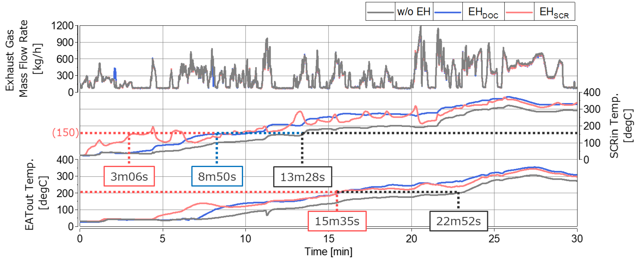 高塚ら(2)は、大型商用車の冷間始動において、制動エネルギー回生等で得た電力を利用し排気後処理装置(尿素SCR)を加熱昇温するシステムについて、実機過渡運転試験(WHTC-cold)を行い、電気ヒータ搭載位置が装置昇温時間とNOx浄化率に与える影響を明らかにしている。図1より、NO2生成を促進しFastSCR反応を加速するために電気ヒータをDOC前に設置した場合(図中EHDOC)は放熱が大きく、SCR前に電気ヒータを設置した場合(図中EHSCR)よりもSCR昇温時間が長期化していることが分かる。この昇温時間の変化により、電気ヒータをDOC前に設置した場合のNOx浄化率(90.7%)は、SCR前に設置した場合のNOx浄化率(91.5%)に対し低くなることが報告された。(小酒)