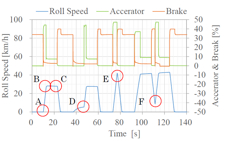 井上ら(1)はは3種類の2軸4WDシャシダイナモで電気自動車を走らせて、実路走行で起こり得る急加減速時の追従性を評価した。評価用に設定した運転パターン(図1)から発進(図中のA)、クリープ車速からの加速(同D)、減速-加速(同F)の3ポイントを選んで試験結果を解析し、アクセルの作動点前後の数秒間に注目した手法でシャシダイナモによる実路走行の再現性を評価できることを確認した。