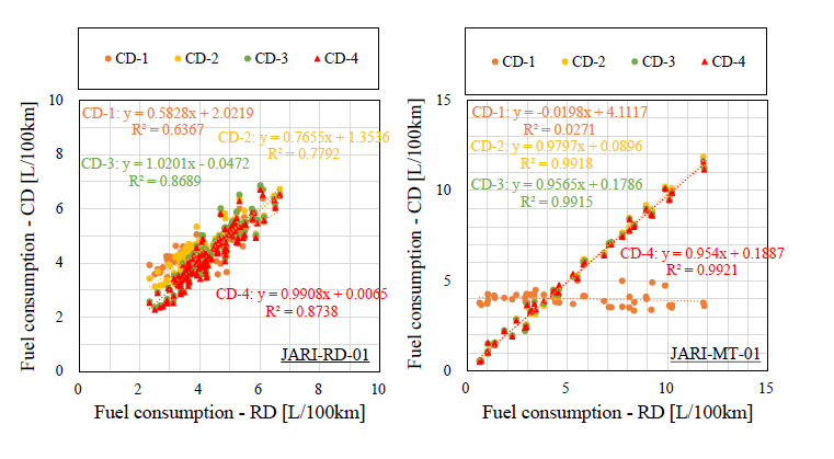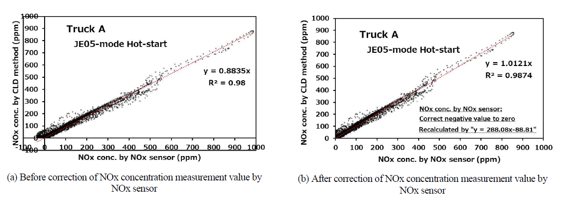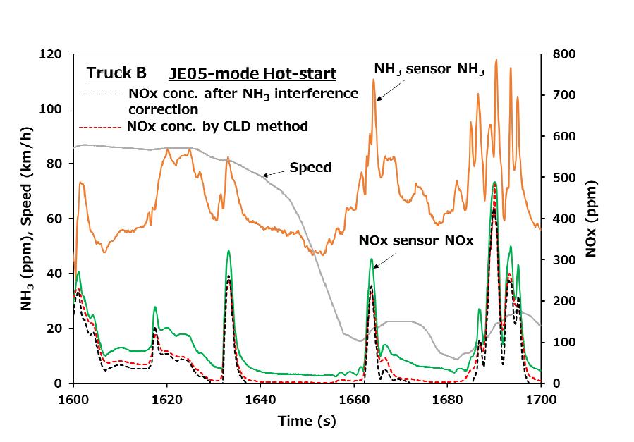 山本ら(3)は2台のディーゼルトラックの排気系にNOxセンサを取り付けてシャシダイナモ上で排気モード走行を行い、センサを用いたNOx評価の測定精度改善策を検討した。NOxセンサは定置型排出ガス分析計に用いられる化学発光(CLD)法と比べて測定精度が劣り、また排出ガス中のNH3をNOxとして誤検出するNH3干渉の問題がある。測定精度については、NOx排出が少ない条件で生じるNOxセンサ出力のマイナス値への変動をゼロに補正し、試験車両の実排出ガスで求めた検量線を用いることで
