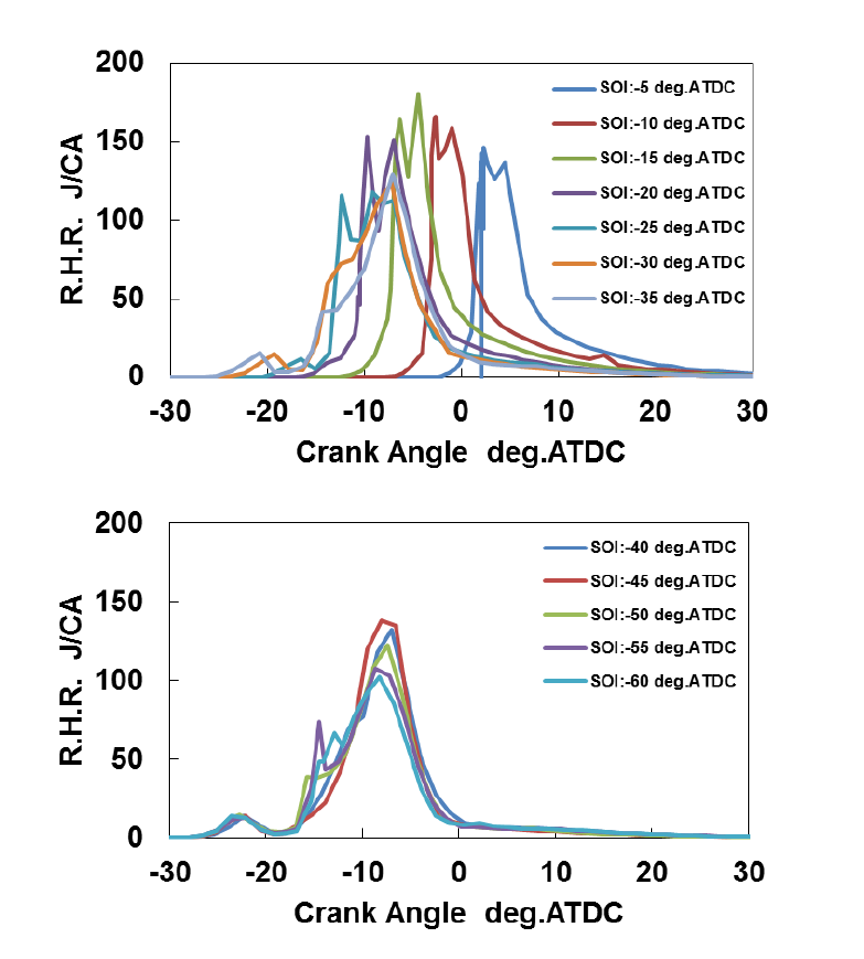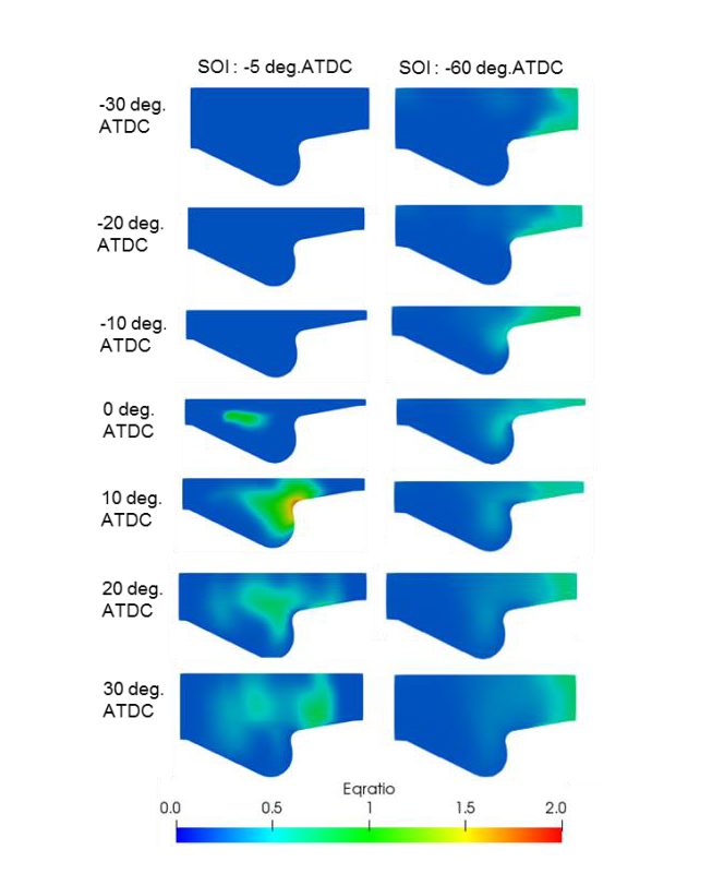 高橋ら(1)は「軽油早期噴射における天然ガスDDFエンジンの燃焼・排出ガス特性」と題した発表で、天然ガスと軽油のデュアルフューエルエンジンの燃焼モデルを構築し、筒内現象の解明と排ガス等への影響の解析を行っている。KIVA-4コードを用い、化学反応スキームにはディーゼルサロゲート機構にメタン、エタン、プロパン、ブタンの素反応を加えたモデルは、実験結果を良く再現した。このモデルを用いて単段噴射において燃料噴射時期を早期化したところ、燃焼開始時期も早期化していったが、燃料噴射時期を-35deg.ATDCよりも早期化しても燃焼開始時期は早期化しなかった(図1)。これは天然ガス燃焼形態が軽油による着火から軽油との予混合燃焼に変化したためであるとしている。また、2段噴射においても、噴射時期が遅い場合には部分的に当量比が濃い領域が存在していたが、早期化することで当量比が1を超える領域がほぼなくなり(図2)、低エミッション化に有効であることが示された。