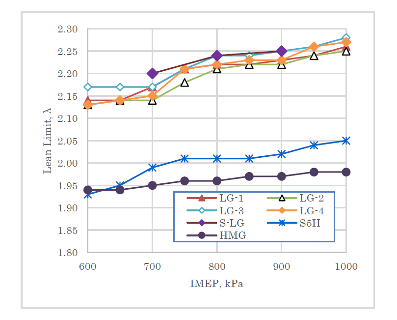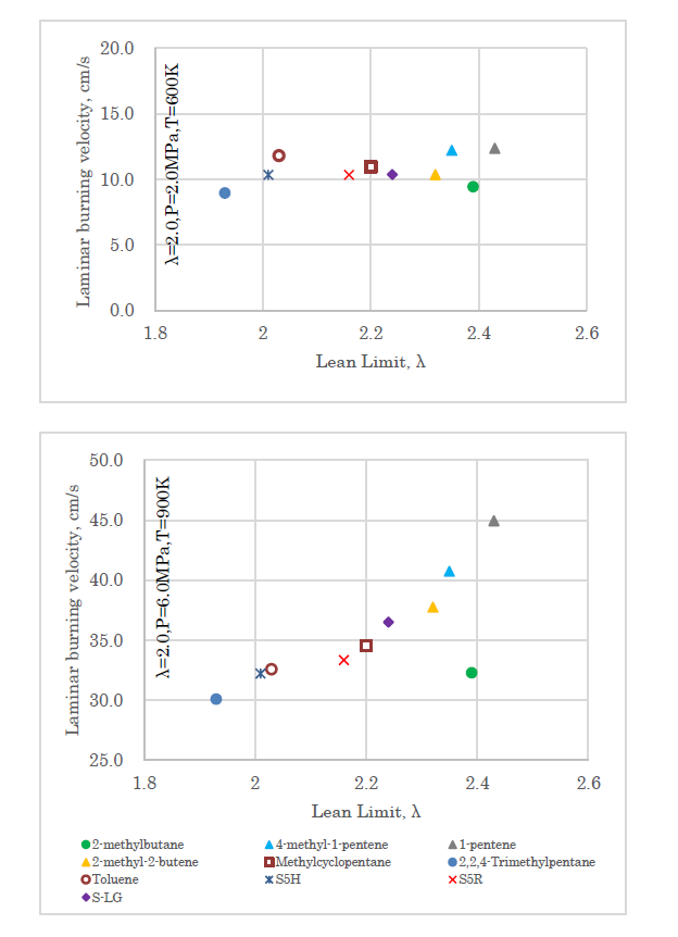 渡邊ら(2)は「炭化水素系燃料によるスーパーリーンバーンエンジンのリーン限界拡大に関する研究(第2報)」と題した発表で,スーパーリーンバーンにおけるリーン限界を拡大し,熱効率を向上しうる燃料組成について検討を行っている。筆者らは前報(3)で,軽質でかつオレフィン分が多い炭化水素系サロゲート燃料を用いることでSIPガソリンサロゲート燃料(S5H)よりもリーン限界が拡大することを示していた。本報では製油所の基材(半製品)を用いて軽質でかつオレフィン分が多い「軽質ガソリン燃料」を作成し,生産時期における生産バランス等により生じる製油所基材の性状(沸点範囲やオレフィン分濃度)の振れ幅を考慮しても,リーン限界拡大特性が再現できることを示した(図3)。この結果より,製油所で大量生産できる可能性が見えたが,今回製造した軽質ガソリン燃料は現行ガソリン燃料と比べると蒸留性状が非常に軽質であるなど性状面の差が大きいことから,実際の市場導入に向けては,既販車への適合性も含めた確認が必要であるとしている.またリーン限界拡大の原因について考察するため軽質ガソリンサロゲート燃料とその構成物質について反応科学計算を実施している。その結果,燃焼後期であるCA90(燃焼割合90%)に近い条件を模擬したP=6.0MPa,T=900K条件における層流燃焼速度とリーン限界の間に相関があることを示している(図4)。一方で反応性の指標とされる1100K付近の着火遅れ時間や燃焼初期条件の層流燃焼速度とリーン限界との間に明確な相関は見られなかった。以上の結果より,軽質オレフィンによるリーン限界拡大は,分子構造の違いによる反応速度の増加に加えて軽質化(低分子量化)による物質移動の増加効果もある程度大きい可能性が示唆されるとしている。