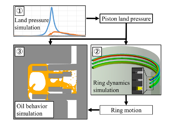 佐々木ら(1)はLOC低減を目的とし、高精度かつ迅速にLOC量を見積もるため、解析モデルの構築と可視化エンジンによる油膜挙動の測定を並行して行い、実用可能なLOC予測モデルの開発を進めている。解析モデルは、3ピースオイルリング側面および背面の流れを対象とし、①ランド圧計算モデル、②リング挙動モデル、③気液二層流を考慮可能なVOF法によるオイル挙動モデルで構成した(図1)。サードランド油膜挙動および油量を可視化実験結果と比較した結果、定性的に一致したが、定量的には乖離が見られたことから、今後、周方向流れ、オイルリング周辺を循環する油量およびドレンホール位置を考慮するため、オイル挙動モデルの3D化を検討する。