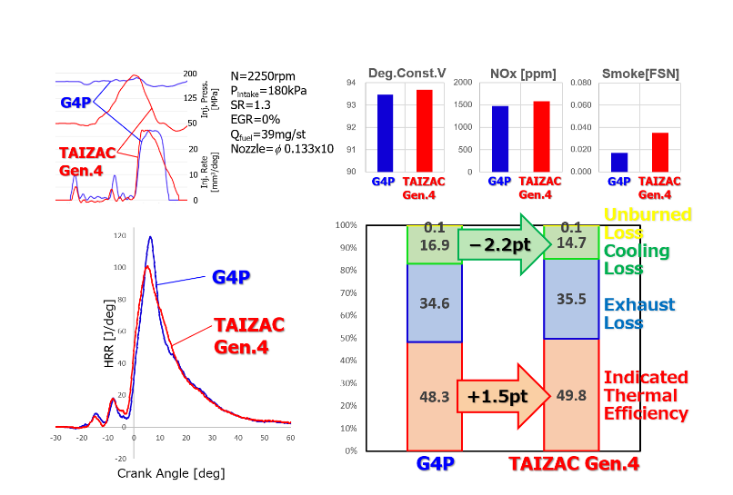 これらに対して本方式TAIZAC(直列2弁瞬時切替駆動式)は、基本構造として、2本のインジェクタを直列に接続し、それを巧みに制御して逆デルタ噴射を実現する。この逆デルタ噴射により、後燃え(燃料噴射終了後の膨張行程に及んで続く緩慢な燃焼)と燃焼室壁面冷却損失の同時低減によるディーゼル機関の熱効率向上を狙っている。これらの詳細な燃焼解析を含んでおり、熱効率改善効果が図5にまとめられている。