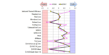 本田技研工業の松田(1)らは、エンジン開発段階における方向性を明確にすることを目的として、スキャッタバンドの構築とそれを活用したエンジン諸元検討プロセスに関する講演を行った。排気量0.66Lから3.5Lの異なる諸元を持つ9台のエンジンを対象に、エンジン単体計測およびCFD解析結果を蓄積し、適切な指標の設定や正規化を行うことで、エンジン間の比較が可能なスキャッタバンドを構築した(図6)。これにより、開発エンジンの強みと弱みを明確にすることが可能となる(図10)。本手法により、開発エンジンの流動強化とオイルダイリューション低減に対する開発指針が明確となり、ピストン形状や燃料噴射制御に関する仕様選定をスムーズに行える結果に繋がった。今後、データ蓄積とともに、技術進化に応じてパラメータや指標を柔軟に設定可能な体制を構築することで、更なる開発の効率化が期待される。