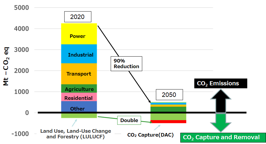 CNに向けた各国の取り組みの中から、欧州委員会(EC)のシナリオ(図1)を例に、CN実現のシナリオを探ってみよう。ECのシナリオは、CO2 排出量を90%削減、CO2 除去量を2倍に増加させてCNを実現している。CN実現のポイントは、CO2 排出量をゼロにするのではなく、一定量削減し、CO2 吸収、除去技術との組み合わせによって実質的なCO2 ゼロを目指すものとなっている。