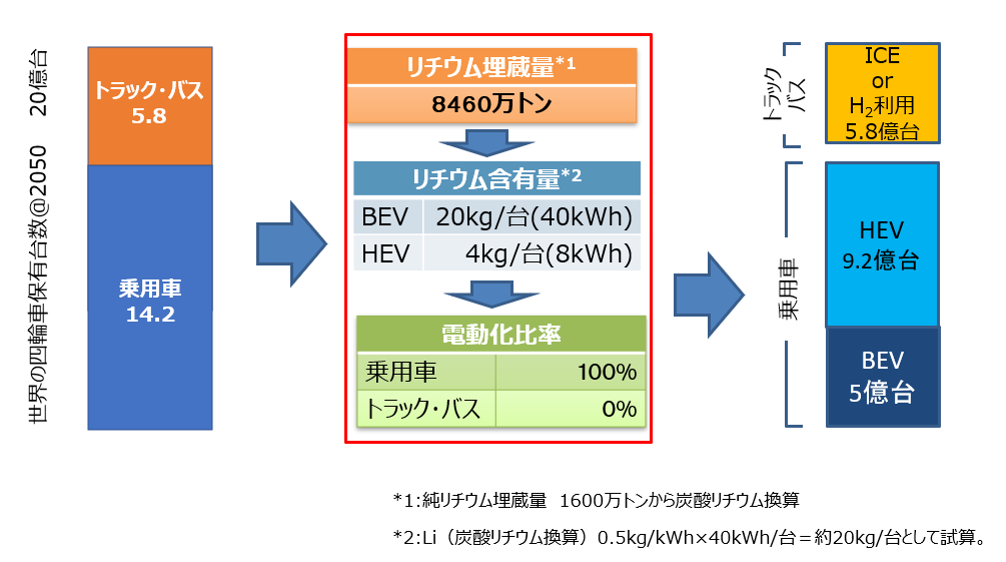 第三の課題である、「バッテリの資源の枯渇問題」は、今後のBEVの台数増との関係が深いため、2050年の台数予測を試みた(図2)。まず、2050年の四輪車の保有台数を予測すると、20億台(うち乗用車は14.2億台)であった (1) 。リチウムの埋蔵量8460万トン(炭酸リチウム換算) (2) 、BEVとハイブリッド車(HEV)用のバッテリのリチウム使用量を20kg/台、4kg/台、2050年時点での乗用車の電動化率100%の条件で予測すると、BEVの台数は5億台となり、2050年時点の乗用車の約35%程度に留まる結果となった。2050年に向けて、BEVの台数拡大には、レアメタル使用量の低減や新材料の開発といった、第3の課題の技術的解決策が必要である。