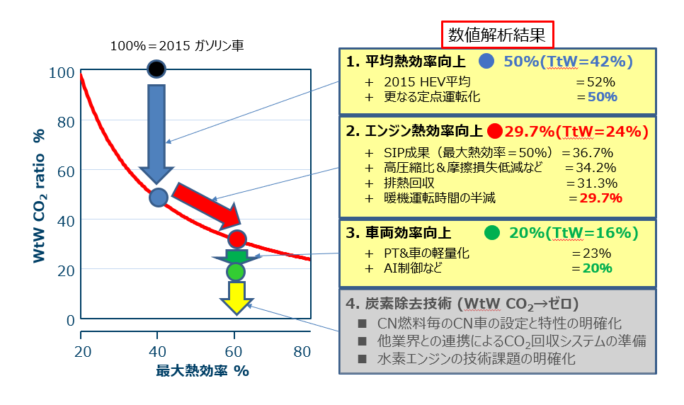 内燃機関搭載車両の課題は、走行中の燃料の燃焼によって発生するCO2 排出である。このCO2 排出量をゼロにするには、様々な技術で排出量を抑制することと、CO2 吸収、除去技術との融合が不可欠である。AICEでは、この課題を解決するための四つのステップを技術シナリオとして定義した。そして、それぞれのステップごとに選定した研究アイテムの効果を、数値解析で検証した。