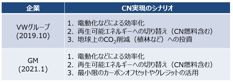 表1に示す自動車会社(VolkswagenとGeneral Motors)のCN実現に向けたシナリオをみても、両社共に、CO2 排出量削減技術として、①電動化などによる効率向上、②再生可能エネルギーの利用、を掲げ、さらに③CO2 吸収・除去技術と、三つの技術を掲げている。