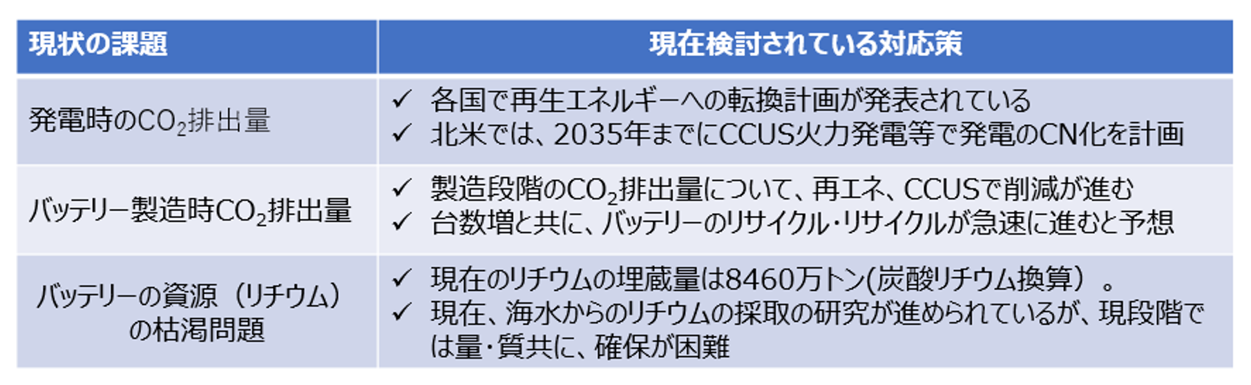 現在の課題を表2に示す。第一の課題である、「発電時のCO2 排出量」は、各国で進む再生可能エネルギーへの転換よって、解決が期待される。また、第二の課題である「バッテリ製造時のCO2 排出量」も、製造時の再生可能電力の利用やバッテリのリユース、リサイクルによって大幅に改善されることが期待される。