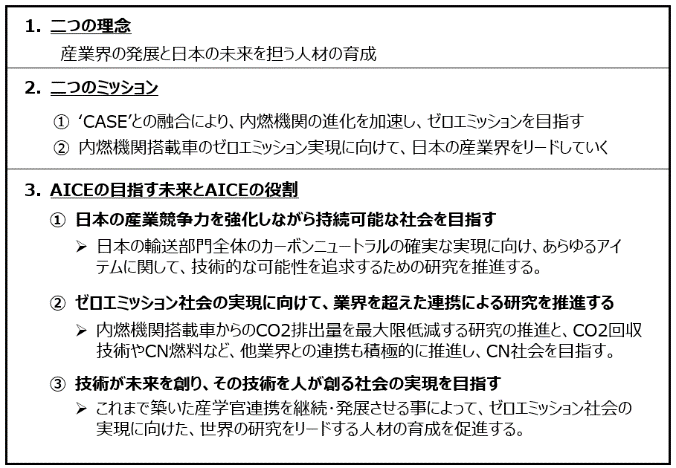 現在、2050年までにカーボンユートラル(CN)を宣言した国は125か国を超え、世界の自動車会社も、電動化を中心としたCNへ取り組みを次々と発表している。電気自動車が大きな期待を集めている今、次のような問いをしばしば耳にする。「内燃機関車両は生き残れるか?」―我々AICEの答えは、‘YES’である。現在、CASEなどの最先端技術との融合によって、CNを実現できる新しい内燃機関を目指して、産学官連携による研究を推進している。