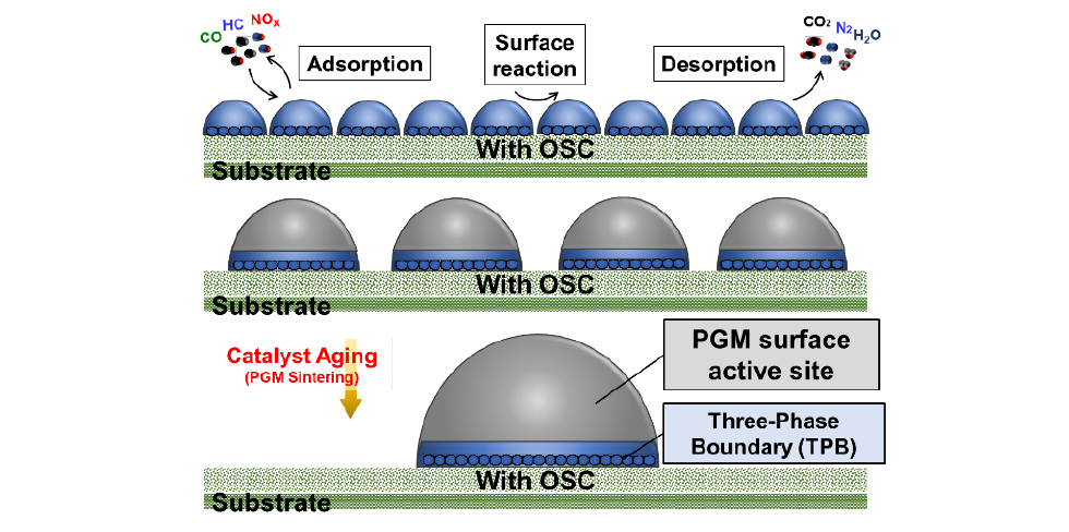 本研究では熱劣化も記述した三元触媒のライトオフ浄化性能を予測可能にすることを目的として、詳細な表面反応メカニズムおよび劣化機構の主要因子を考慮した三元触媒反応モデルを構築した。各熱物性値の推算からPGM活性サイト上における反応スキームの速度パラメータを同定可能とし、PGM表面およびTPB活性サイトを考慮した反応モデルを構築した。その際、酸素原子の詳細反応パスを考慮し、各種雰囲気場におけるTWCライトオフ浄化挙動を概ね再現することを可能とした。劣化モデルでは、PGM粒子の熱劣化に伴うシンタリングに伴う2種類の活性サイト量変化を考慮することで、TWCのライトオフ浄化性能の熱劣化を再現した。