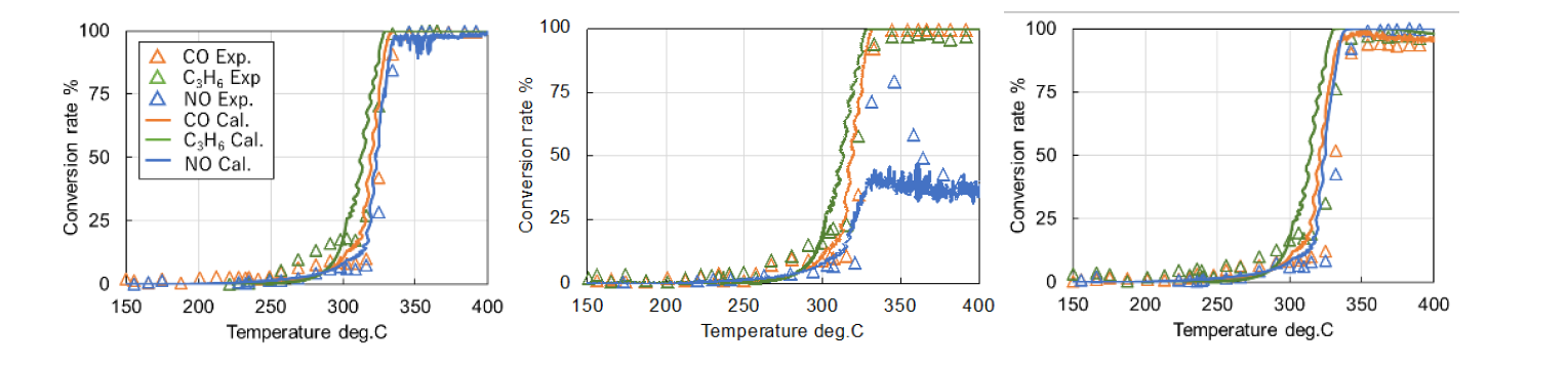 推定された各劣化触媒の活性サイト密度をモデルに入力し、劣化 Pd/CZ触媒を対象に、化学種5種(CO,C3H6,O2,NO,N2)を供給したライトオフ実験との検証を行った。表1に供給ガス条件を、実験および計算結果を図4に示す。図4より、劣化モデルはライトオフ浄化性能を概ね予測できていることが分かる。このことから、PGM上における2種類の活性サイトの特性とシンタリングに伴う各活性サイト量の変化を考慮することで、本数値計算モデルにて劣化触媒による浄化性能を概ね予測することを可能とした。